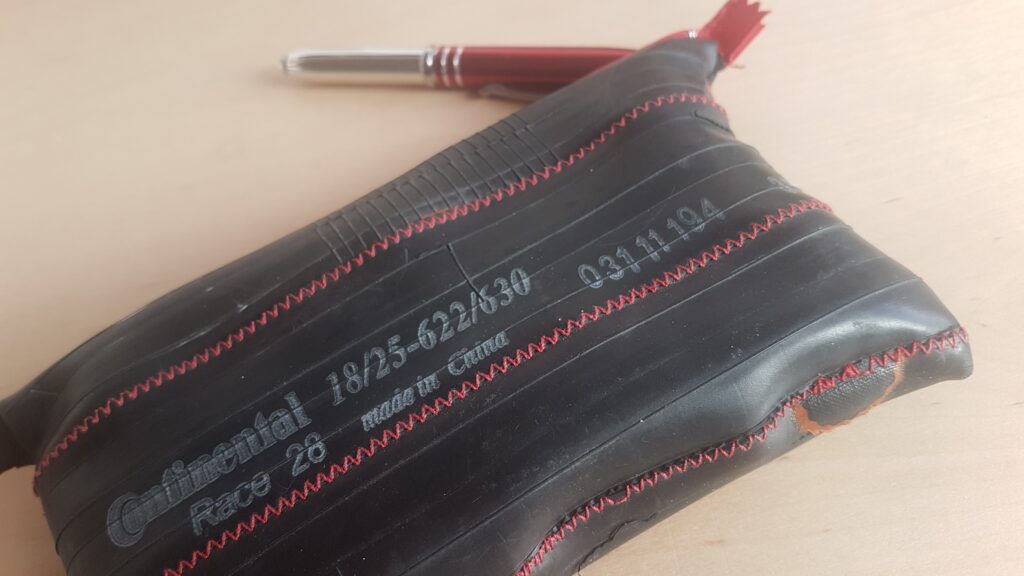 Trousse réalisée en recyclant de vieilles chambres à air de vélo