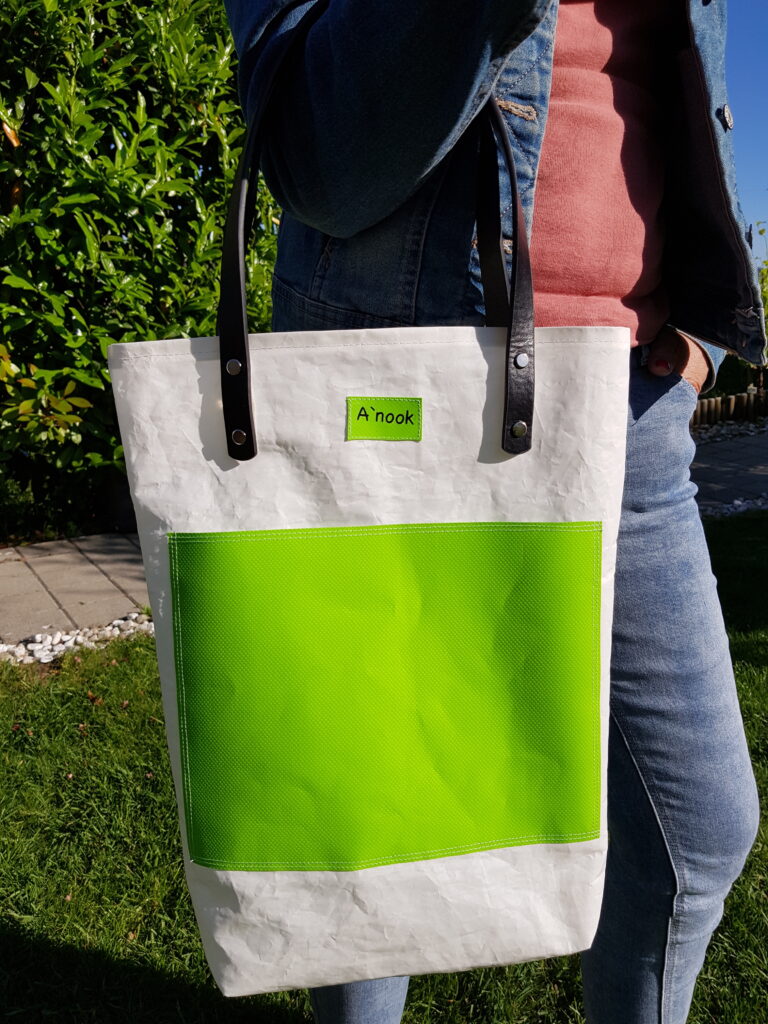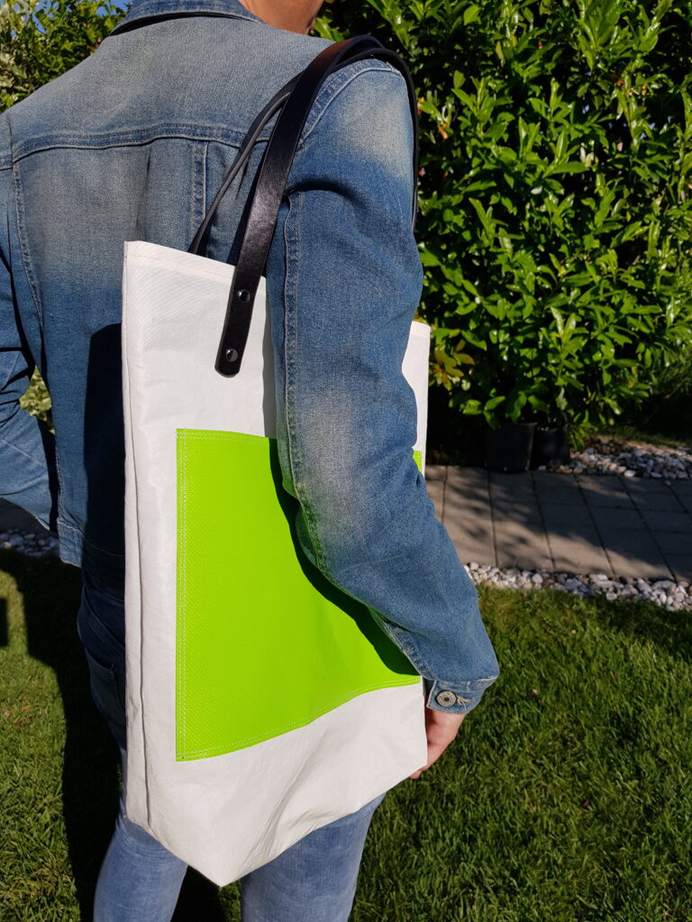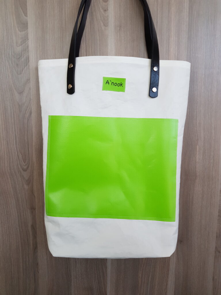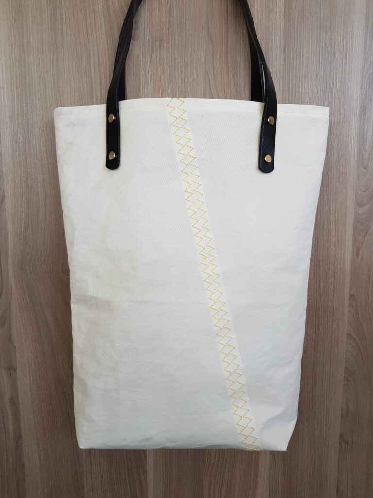 Ce sac, très léger, a été réalisé à partir d’une voile de bateaux recyclée. La poche extérieure du sac, de couleur citron vert, est réalisée en bâche. Deux anses en cuir pour le porter à la main ou à l’épaule.