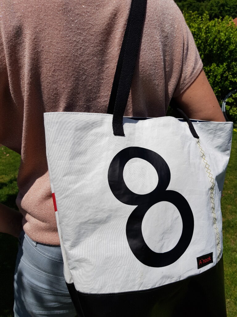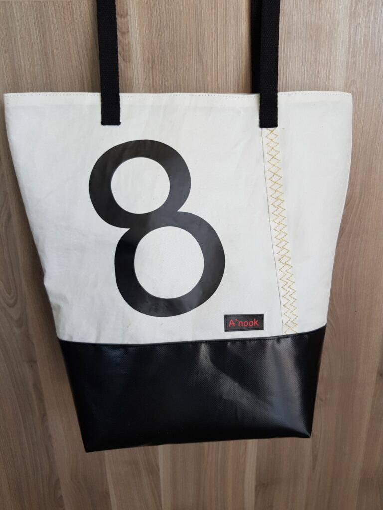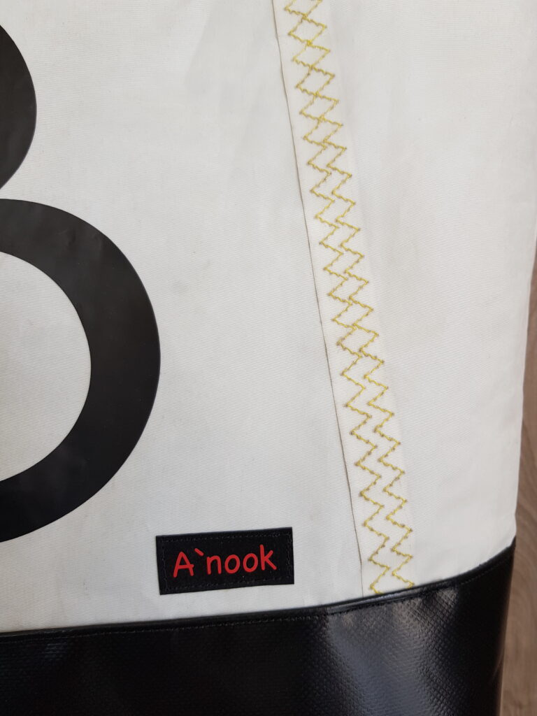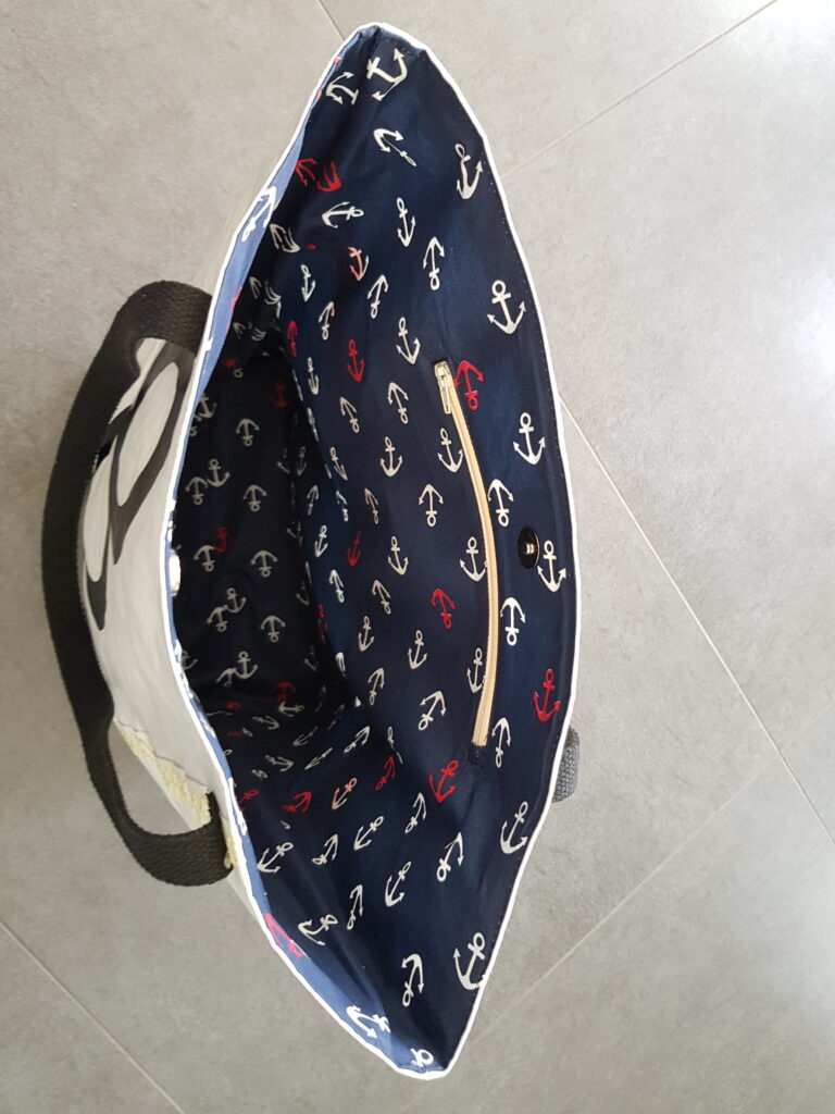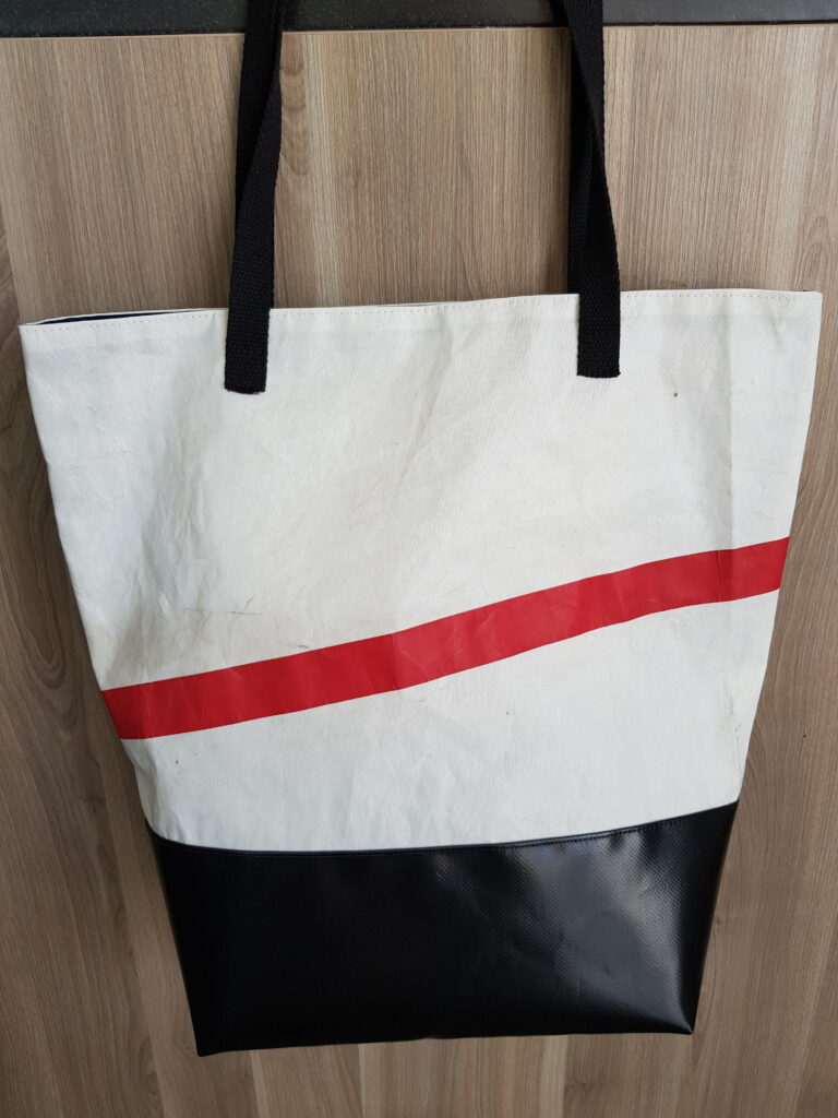 Réalisé à partir d’une voile de bateaux recyclée. La base du sac, de couleur noire, est réalisée en bâche ce qui rend l’assise du sac très solide. Il se ferme avec une pression aimantée. Il possède une poche intérieure qui se ferme avec une fermeture à glissière. Deux grandes anses noires. La doublure est en coton.