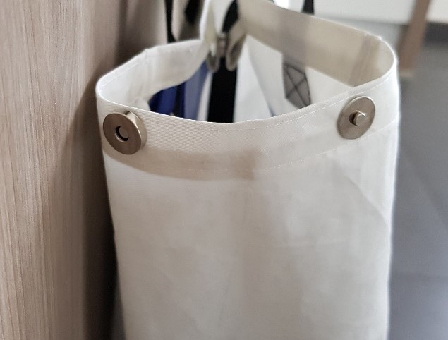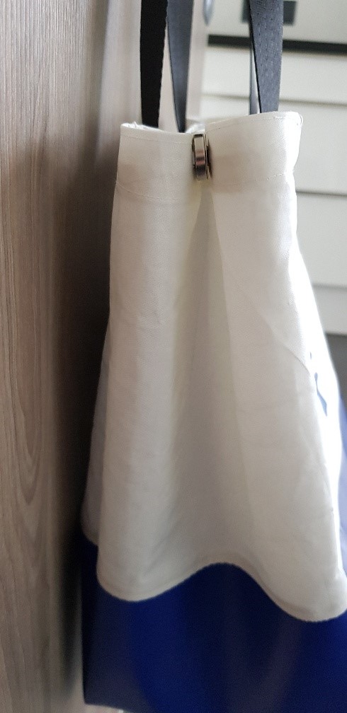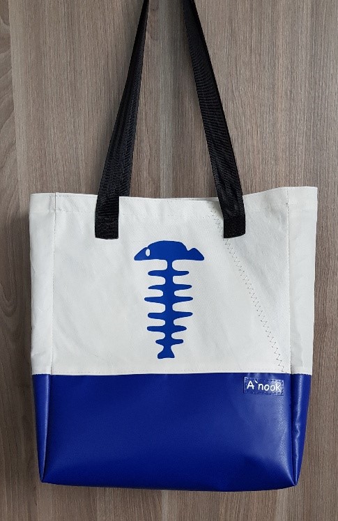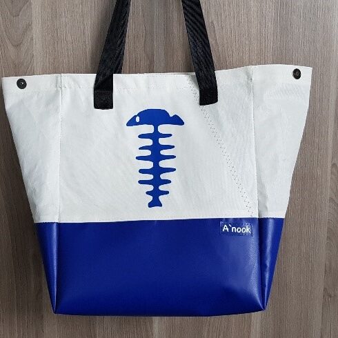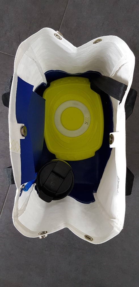Réalisé en voile de bateaux recyclée et en bâche bleue. Ce sac permet de recevoir ton tupperware, tes fruits et ta gourde pour ton diner. Ce sac peut être fermé sur les côtés pour le rendre plus étroit.
