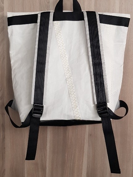 Les anses sont confectionnées avec des ceintures de voiture et sont renforcées pour plus de confort. Il se ferme avec une fermeture éclair et une boucle de ceinture. Il a de nombreuses poches (deux sur l’avant du sac, deux à l’intérieur et une grande poche à l’intérieur qui a été renforcée pour y mettre son ordinateur portable jusqu’à 15 pouces)