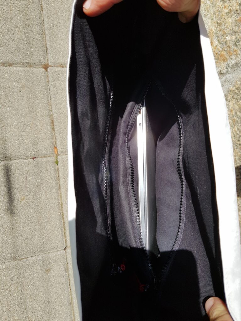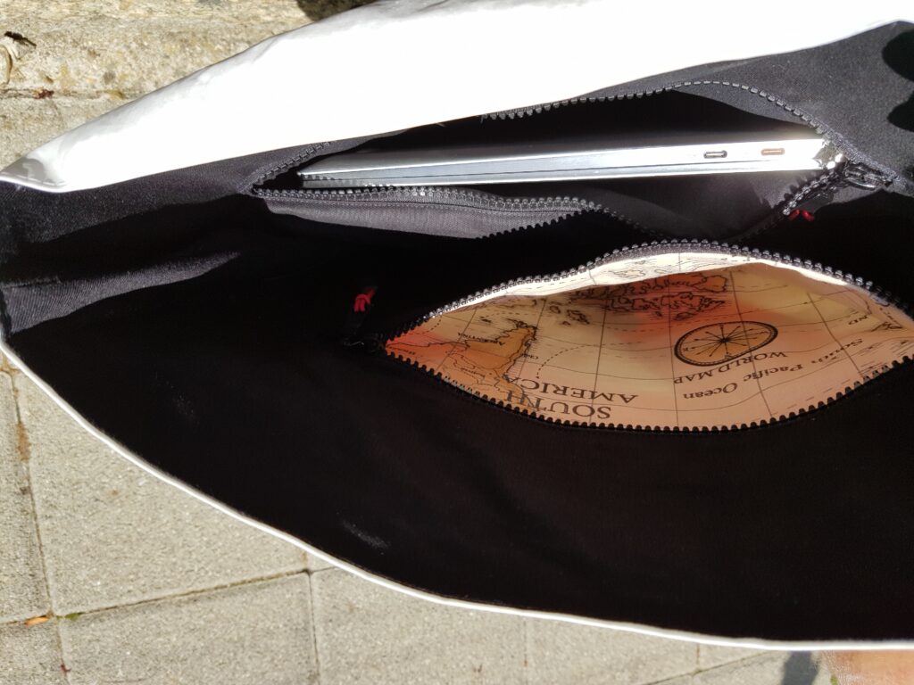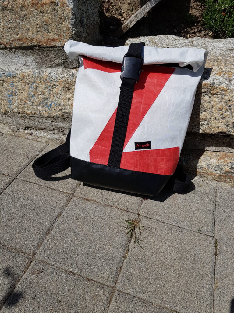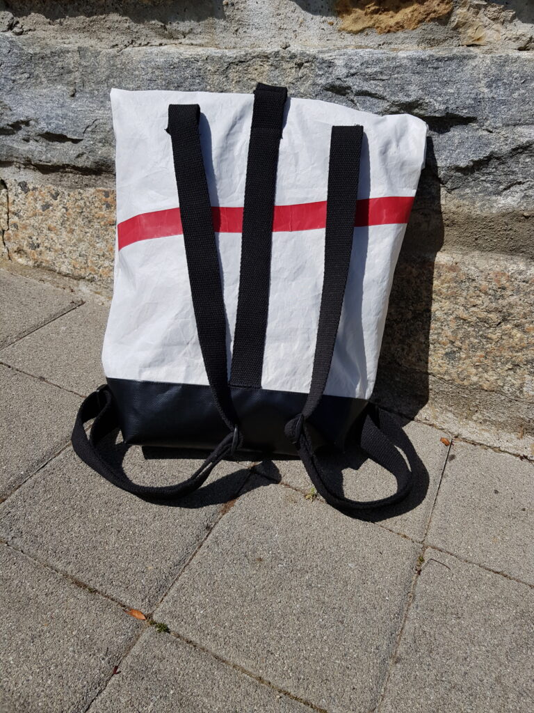 Réalisé à partir d’une voile de bateaux recyclée. La base du sac, de couleur noire, est réalisée en bâche ce qui rend l’assise du sac très solide. Une grande poche intérieure pour y mettre un ordinateur de 13′. Une petite poche pour y mettre son téléphone, clés etc…