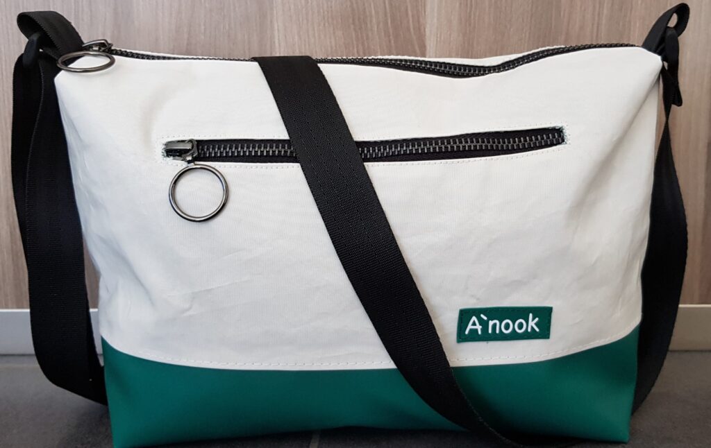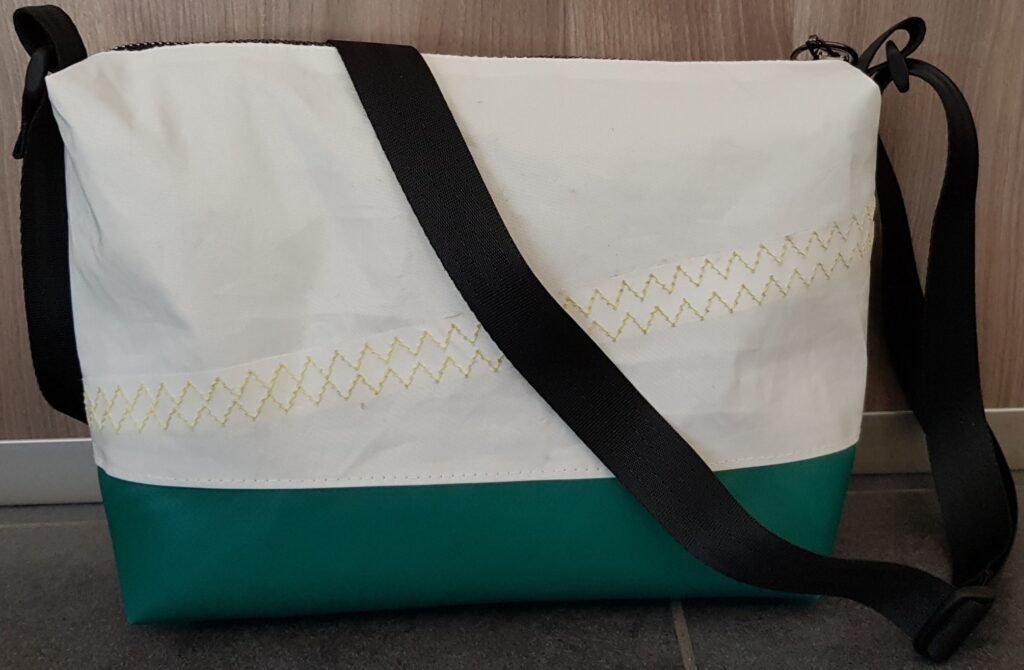 Réalisé en voile de bateaux recyclée et en bâche vert mat. Il a trois poches dont deux avec fermeture à glissière. La sangle est ajustable.