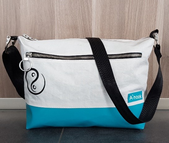 Réalisé en voile de bateaux recyclée et en bâche émeraude. Il a trois poches dont deux avec fermeture à glissière (extérieur et intérieur). La sangle est ajustable.