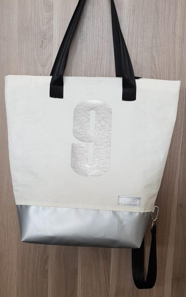 Réalisé en voile de bateaux recyclée et en bâche grise. Il est étanche, léger et très solide. Il peut être porté à l’épaule ou au dos grâce à sa sangle amovible. Il a une poche intérieure zippée pour ranger le téléphone et un porte-clés pour trouver les clés tout de suite.