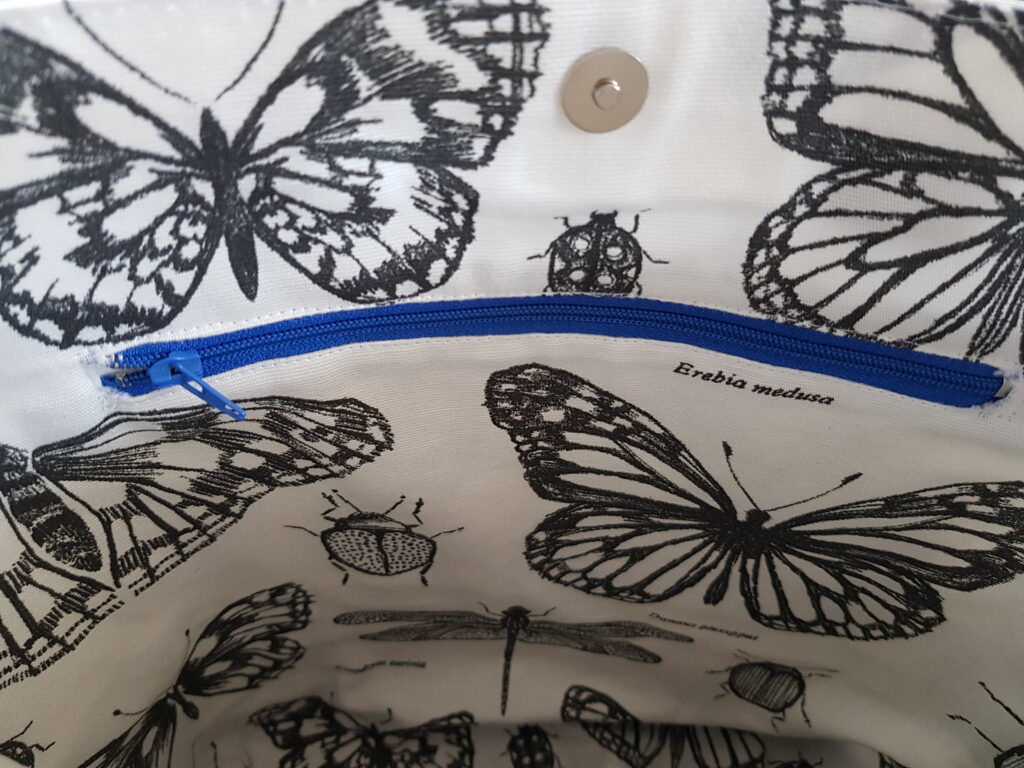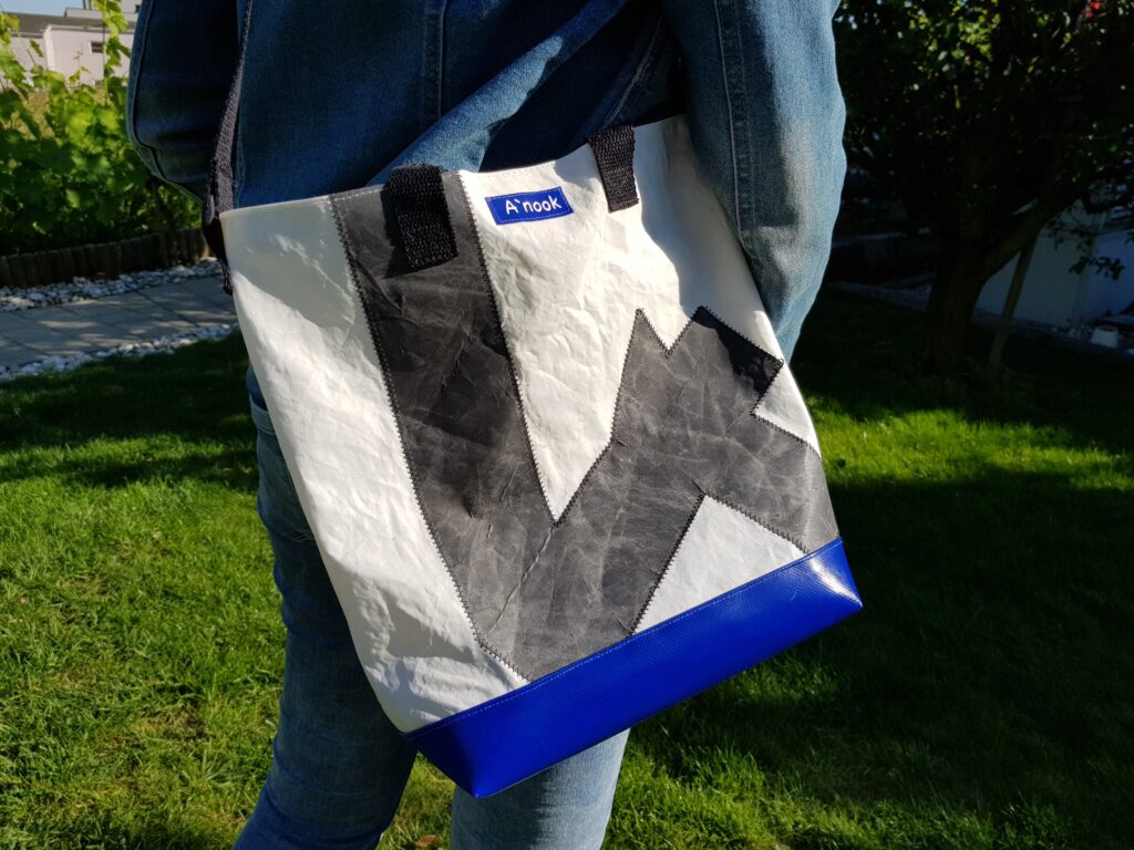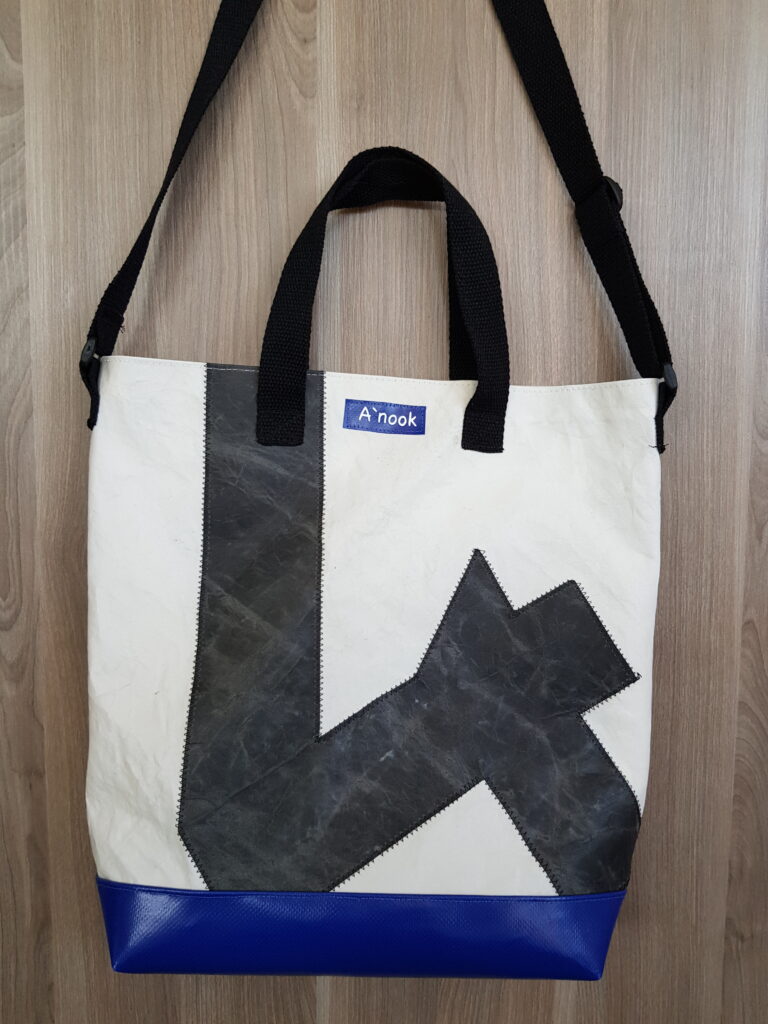 Ce sac a été réalisé à partir d’une voile de bateau 100% recyclée. La base du sac, de couleur bleue, est réalisée en toile de bâche ce qui rend l’assise du sac très solide. Il se ferme avec une pression aimantée. Il possède une poche intérieure qui se ferme avec une fermeture à glissière. Deux anses noires pour le porter à la main et une grande anse réglable pour le porter en bandoulière. La doublure est en coton.
