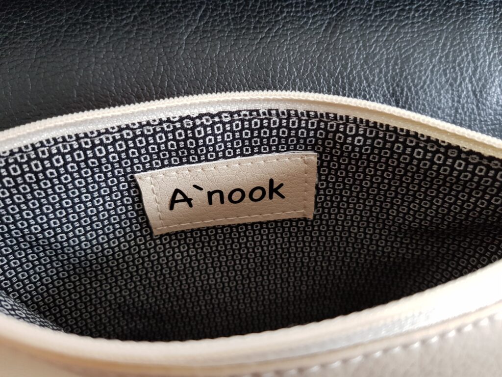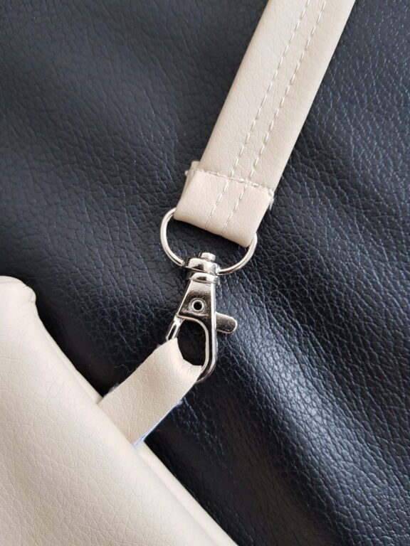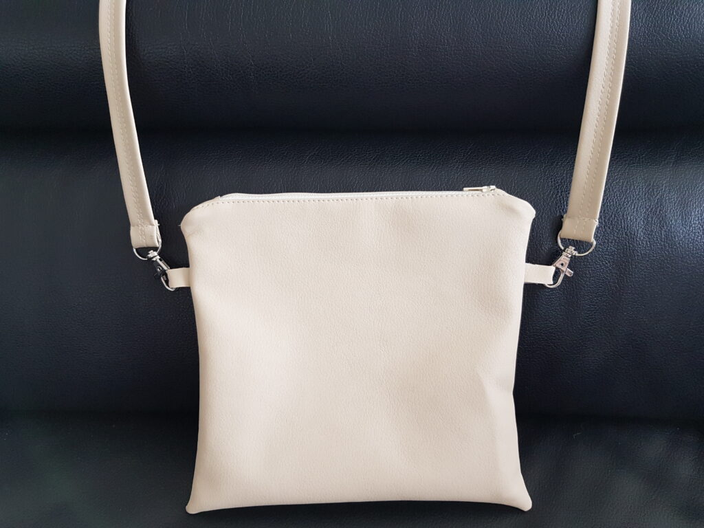 Ce sac réalisé en simili-cuir beige se ferme avec une fermeture éclair. La doublure intérieure est à motif (blanc/noir). La bandoulière est fixée avec des mousquetons.